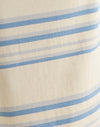 The Amalia midi skirt in black, brown, and blue stripes. Featuring a low-rise design with a funnel-through drawstring waistband, ending just below the knees. Style with the matching Natcha top.