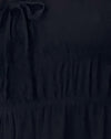 In a black crinkle non stretch fabric, the Cove top features a sleeveless bandeau design with ruched detailing to under bust and waist and a loose fitting hem with functional tie to the neckline