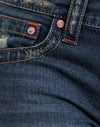 In a low-rise style with a thick belt band, these jeans feature a slim straight leg, with pockets on the front and back, branded back tab, button and rivets, in a ripped, distressed true blue wash. Complete the look with Dulcet long sleeve top.
