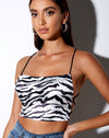 Back-up your style with the Ozka top. In a black and white zebra print this crop features a square neckline with backless fit and tie up strap detail. Wear solo with denim or co-ordinate it with the Zigi skirt.