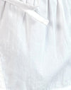 Loose fit blouse in a white poplin fabric with a gathered waistline to create a voluminous hem and puff sleeves. Featuring white binding and three tie closures down the centre front. Pair with our Denim hot pants.